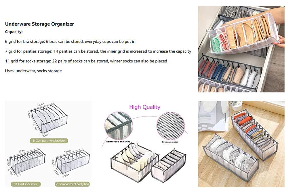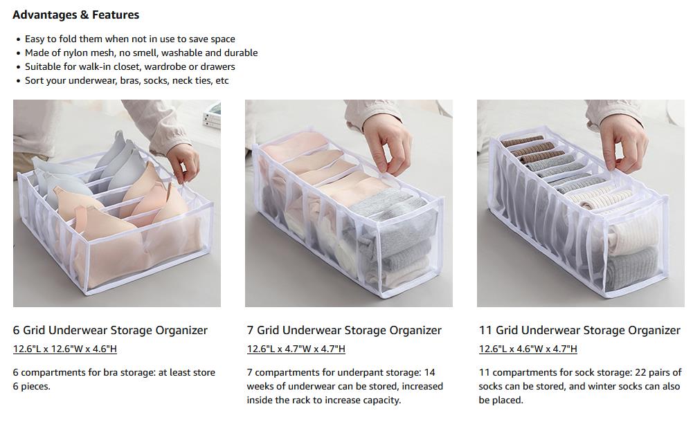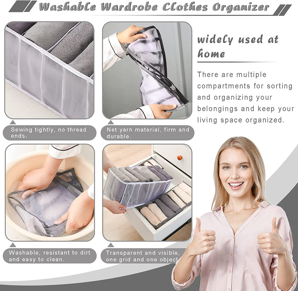 LARGE ORGANIZER SIZE: The large clothing drawer organizers has 2 size designs (7 Grids Large Size: 15.75*11.8*8.6 inch; 9 Grids Large Size: 17.3*11.8*8.6 inch) . It can meet all your needs and can solve most of the daily clothes storage problems.
