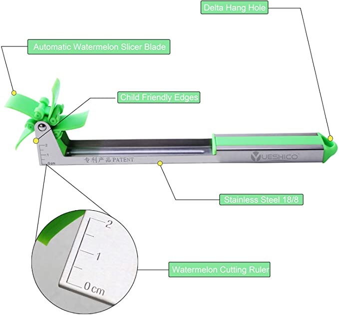 NEWEST SUPERIOR DESIGN: Your best solution for eating watermelon design . This watermelon slicer come with one automatic cutter blade, just push the watermelon slicer tool into watermelon, watermelon cubes come out automatic. Watermelon cutting ruler help you to measure 0-2CM cubes as your ideal size.