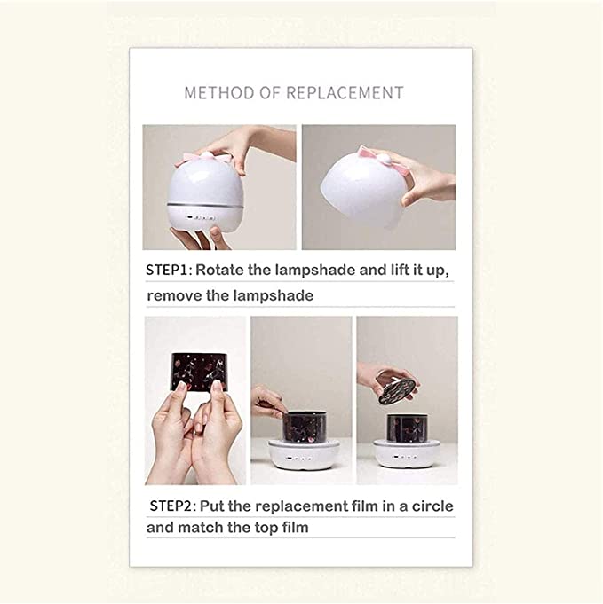 Projection lamp and nightlight: This product can be used as a projection lamp and nightlight, generally as nocturnal light with cover. When removing the cover and placing the film, several images can be projected on the roof and the surrounding walls, creating beautiful rooms.